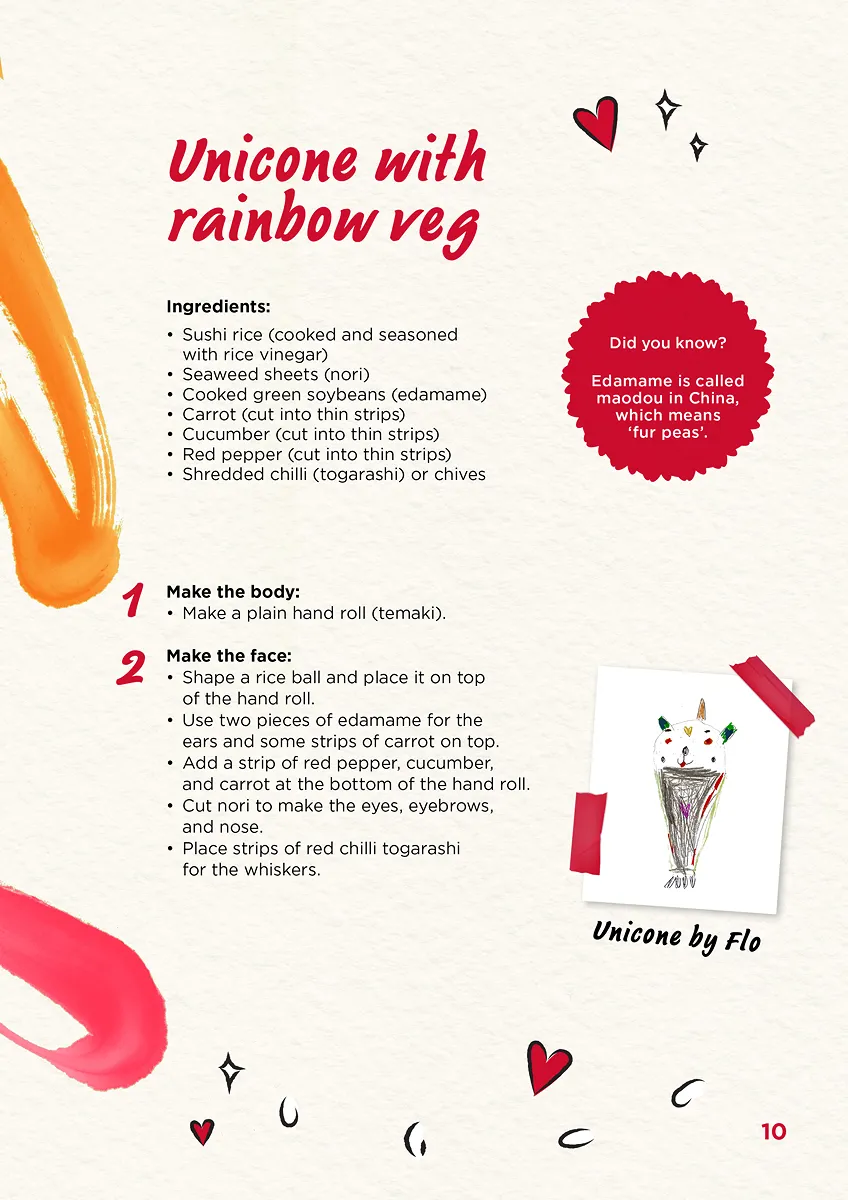 To celebrate this cultural change, we’ve partnered with the imagination experts – your kids – to create the world’s first sushi recipe book designed entirely by children. Every recipe started as a wild, wonderful doodle by a real child, and with the help of singer, actress, and mum Alexandra Burke, these designs were transformed into family-friendly recipes by Japanese chef Yuki Gomi.